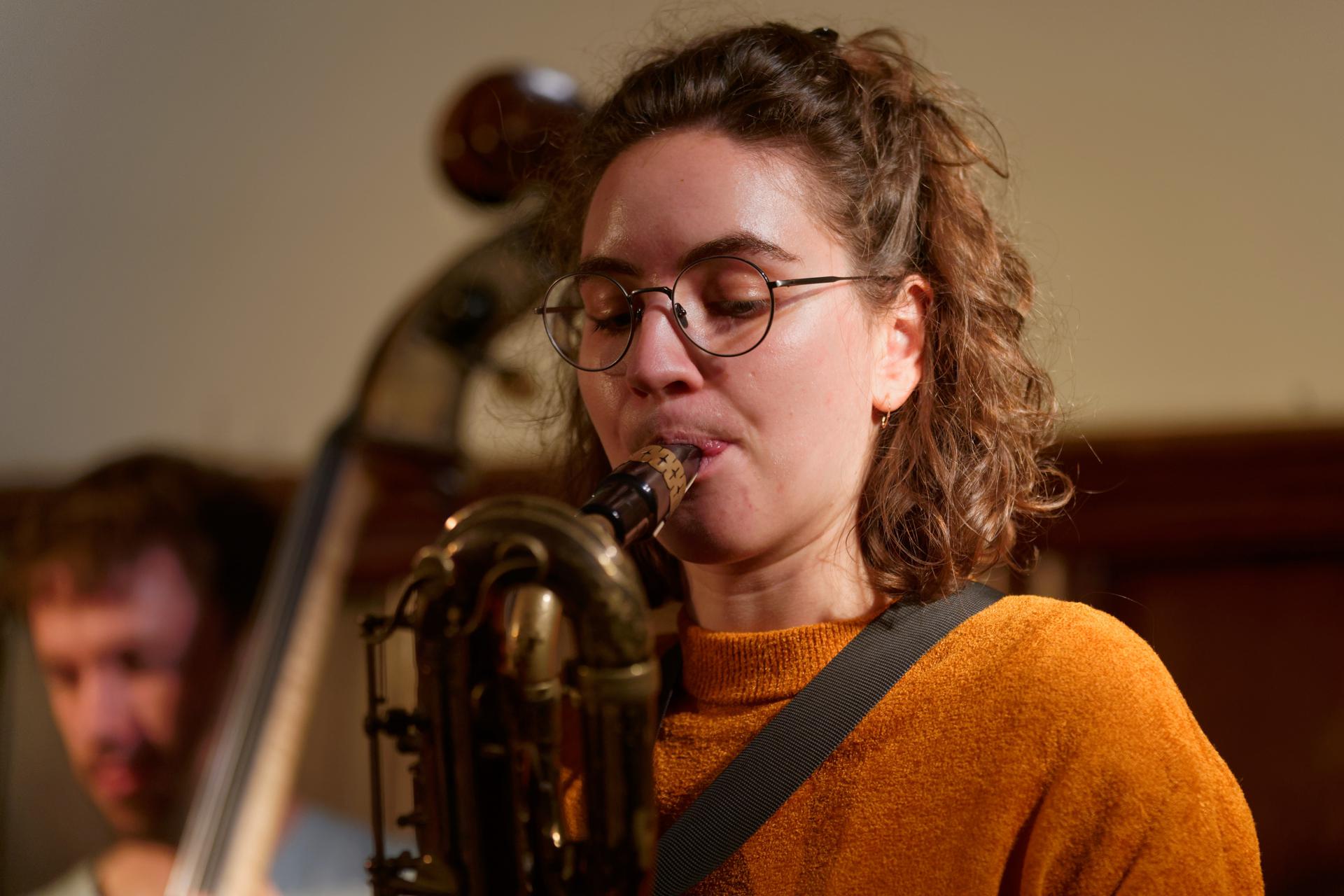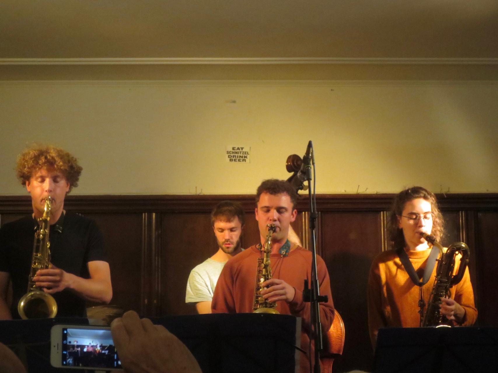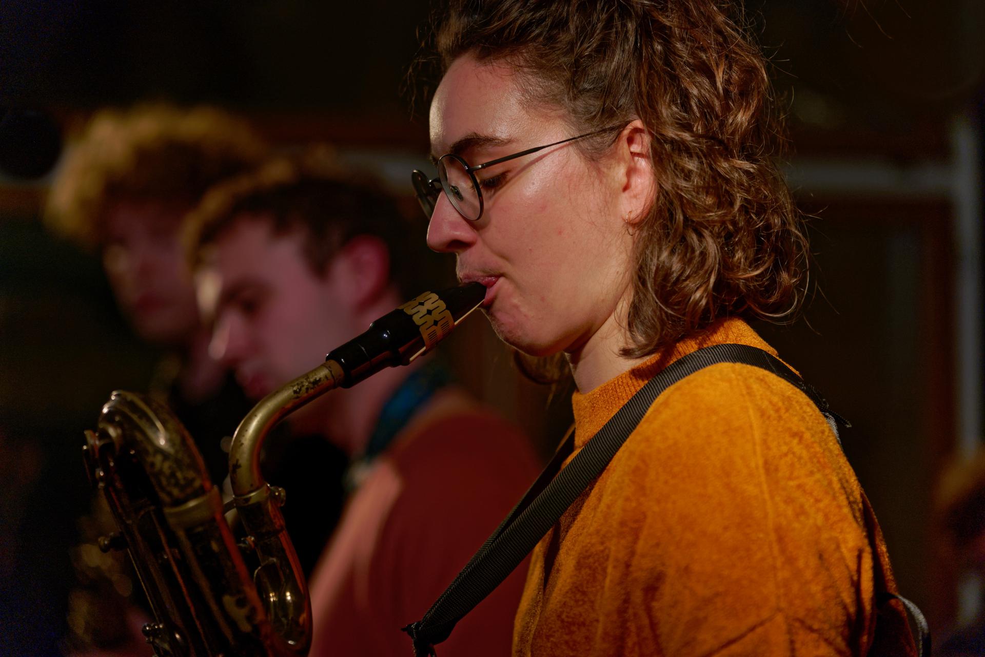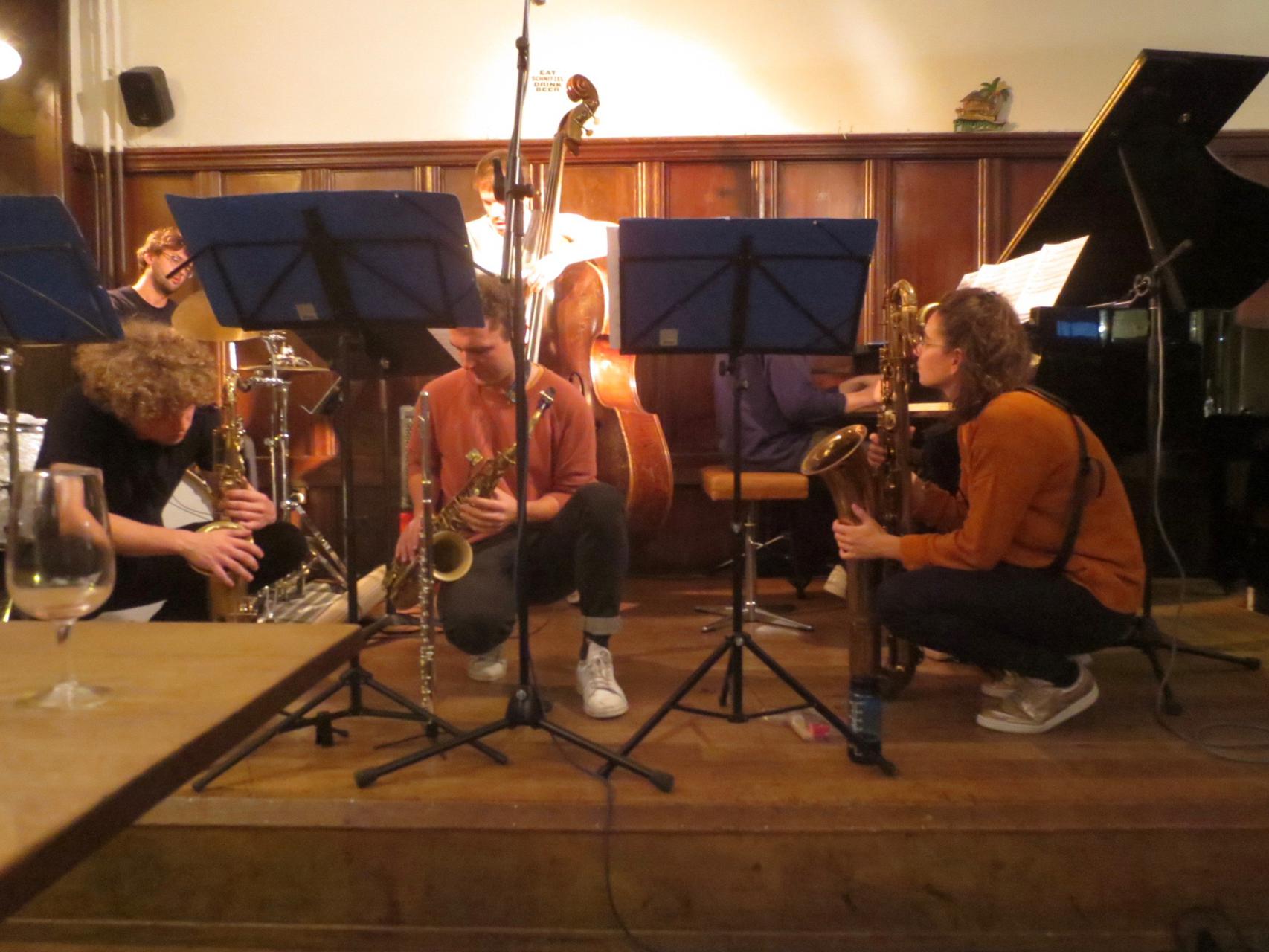 Kira Linn Linntett mit Kira Linn am Bariton, Nino Wenger am Alto, Christopher Kunz am Tenor, Lukas Keller am Bass, Lukas Grossmann am Piano und Johannes Koch am Schlagzeug
